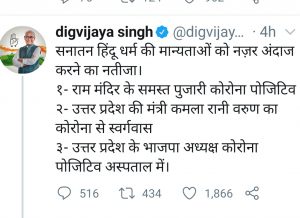 दिग्विजय ने ट्वीट करके तंज कस्ते हुए कहा की ‘मंदिर पूजन के लिए हिंदू धर्म की मान्यताओं को नजरअंदाज किया गया है। इसी वजह से गृह मंत्री अमित शाह से लेकर राम मंदिर के पुजारी तक कोरोना संक्रमित हो गए हैं।